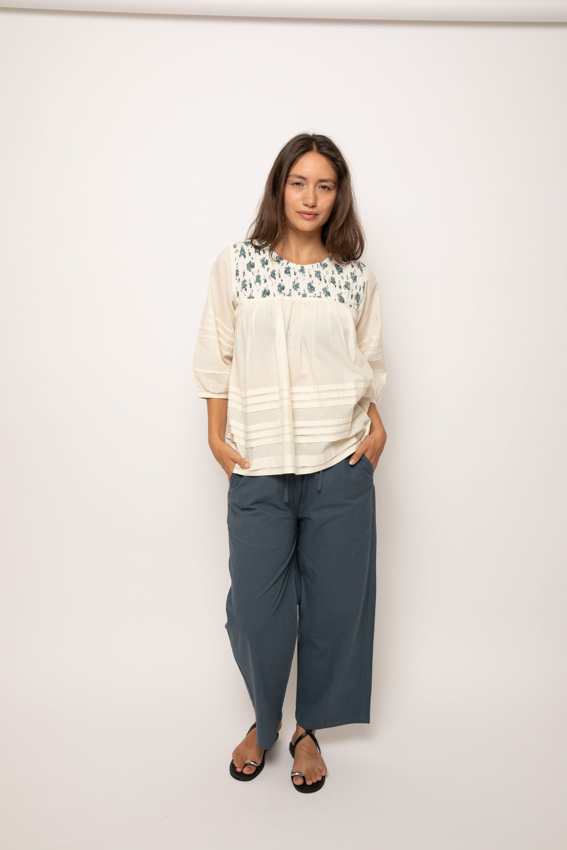 Beautifully hand block-printed on hand loomed cotton fabric. Featuring a floral pattern patched with stripe, the pleated details with vintage feel and touch.